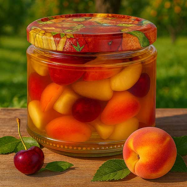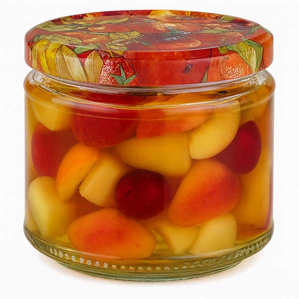 - Barva: Víčko s dekorem ovoce, bílé těsnění.