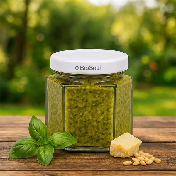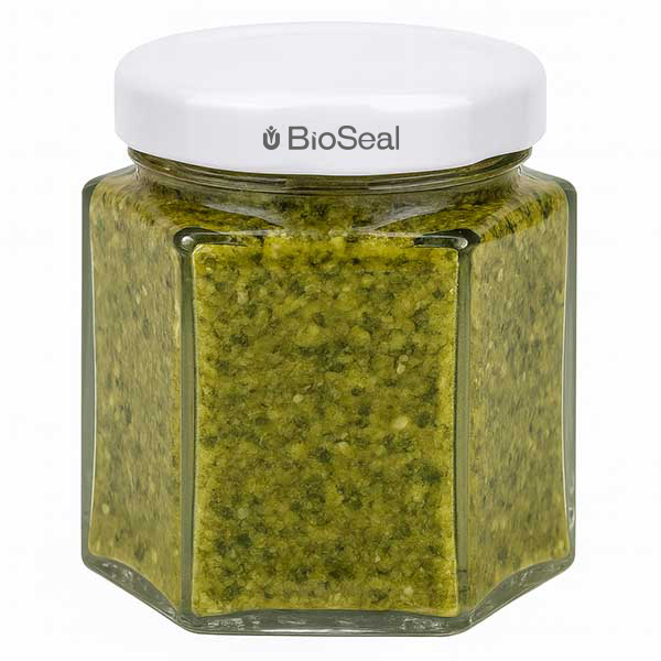 Šestihranná sklenice o objemu 47 ml s bílým víčkem BioSeal UNiTWIST.