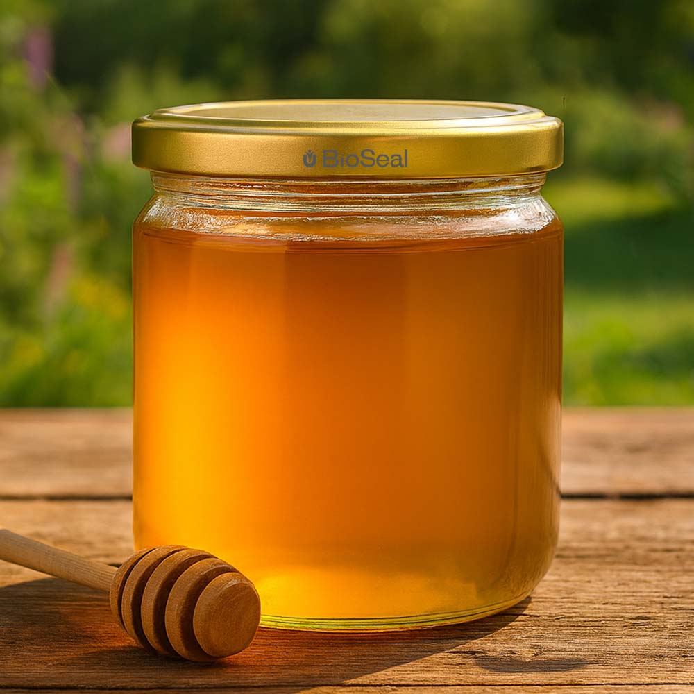 Hochwertiges 500 g Honigglas mit elegantem goldenem Deckel BioSeal UNiTWIST. Die robuste Verarbeitung und der sichere Schraubverschluss machen dieses Glas ideal für große Honigportionen, Direktvermarktung und Premium-Geschenksets.