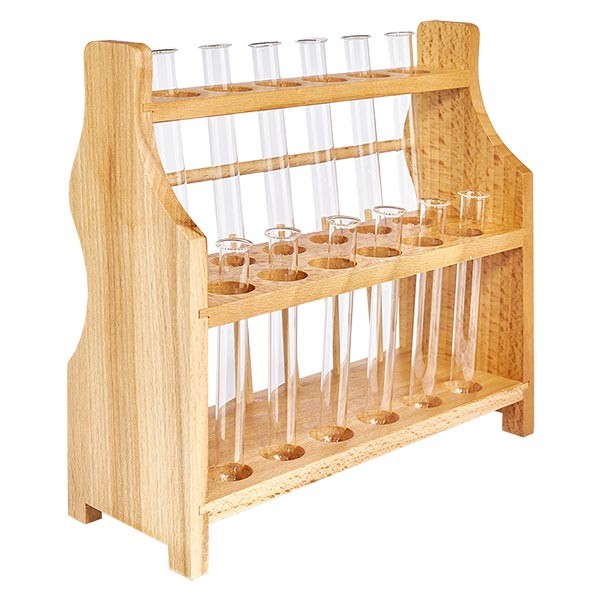 Dřevěný stojan na zkumavky s 12 borosilikátovými zkumavkami 100x12
