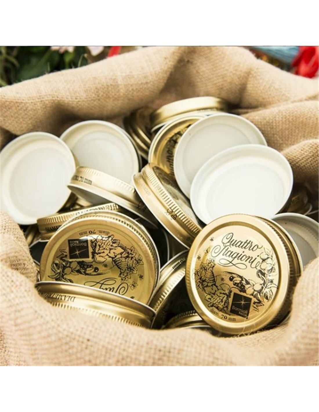 Naše víčka Quattro Stagioni jsou vyrobena z vysoce kvalitního bílého plechu, jsou odolná a snadno se s nimi manipuluje. Jsou vybaveny praktickou kovovou sponou a gumovým těsněním, které zajišťuje vzduchotěsnost